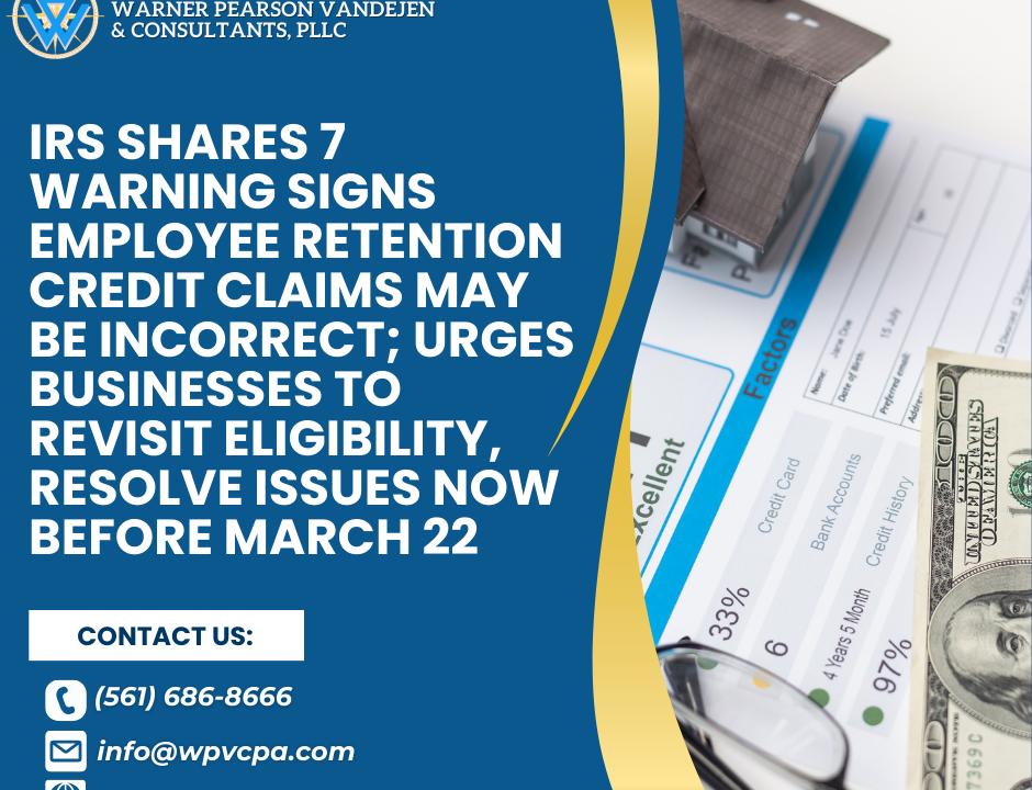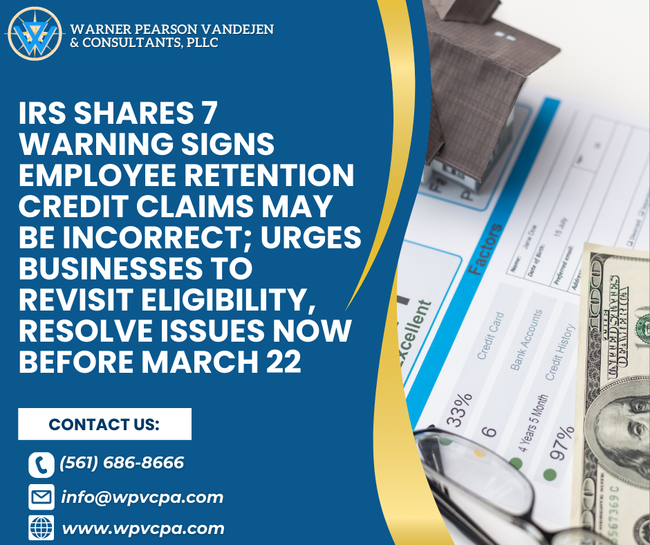 IRS shares 7 warning signs Employee Retention Credit claims may be incorrect; urges businesses to revisit eligibility, resolve issues now before March 22