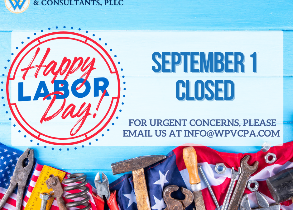 Our office will be closed on September 1st, in celebration of Labor Day. We will resume operations on Tuesday, September 2nd. For urgent requests, please email us at info@wpvcpa.com.